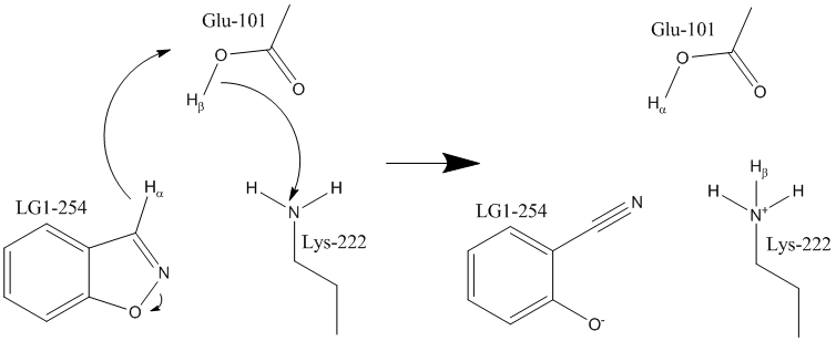 In this reaction, the heterocyclic ring in 5-nitro-benzisoxazole opens to form a cyanide or nitrile group and a hydoxyl anion. This reaction does not occur in nature because the heterocyclic ring substrate is highly strained. That strain is relieved when the ring opens, so the reaction is, for all practical purposes, irreversible.