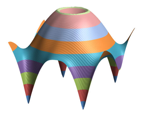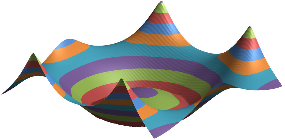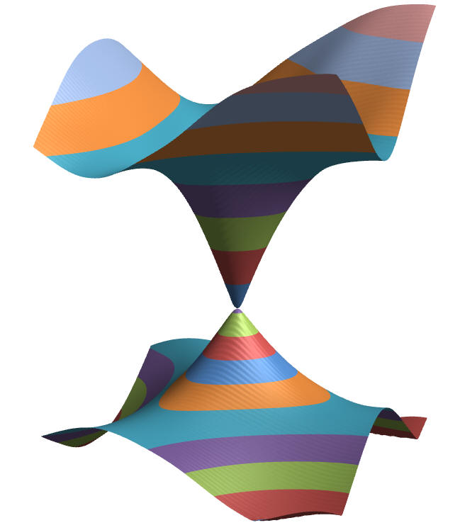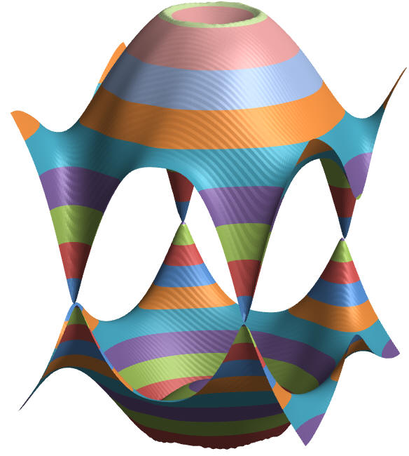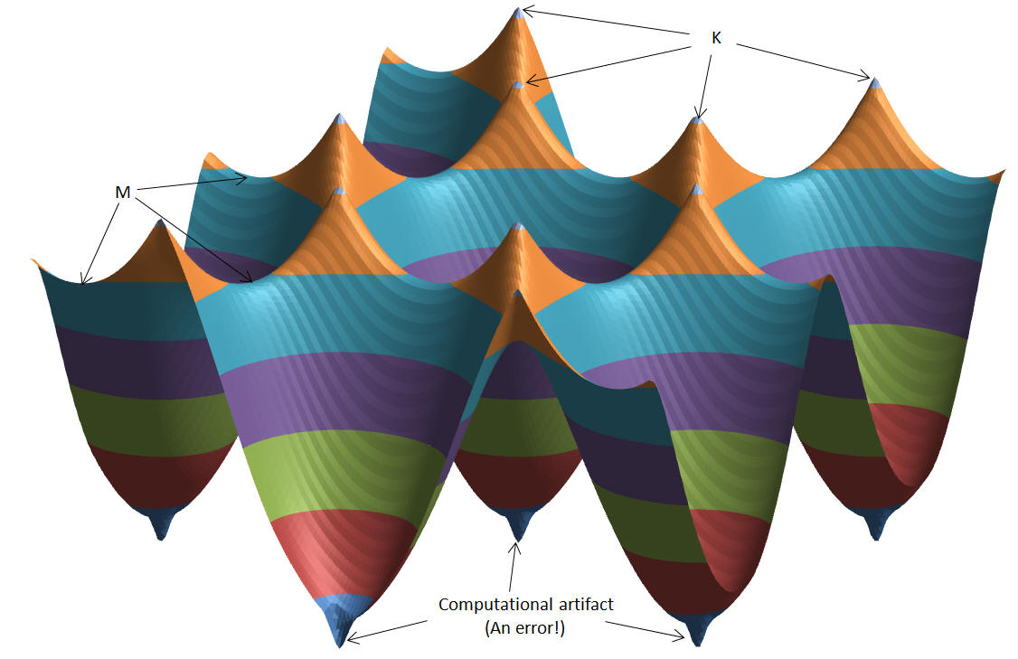 Program BZ generates a square array of 161 by 161 points, suitable for use with Excel; this allows very nice 3-D charts to be generated.  Examples of these are shown in Figure E4.  Now the cause of the strange circular structure near the Γ point in Figure E3 in Band 8 can be identified.  From Figure E1 it is apparent that the bands that meet at K cross other bands as they move to Γ, and the circular structure represents the region where one band passes through another.  This band-crossing can also be seen in Figure E4 Band 9, where a similar structure can now be seen in the region of Γ, although the effect is not obvious in Figure E3 Band 9.  As mentioned earlier, the occupied and empty bands meet at K, and this can be seen in Figure E4, Bands 8 and 9, and in detail in the next figure.
