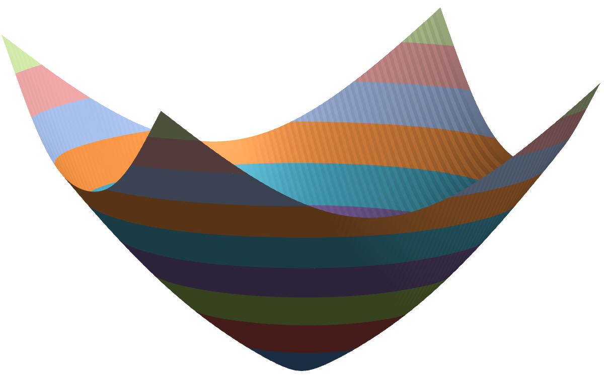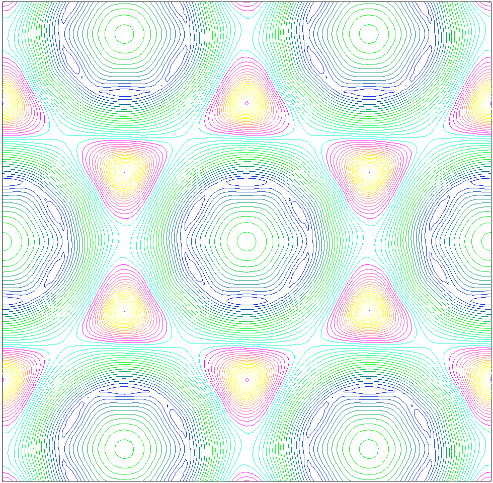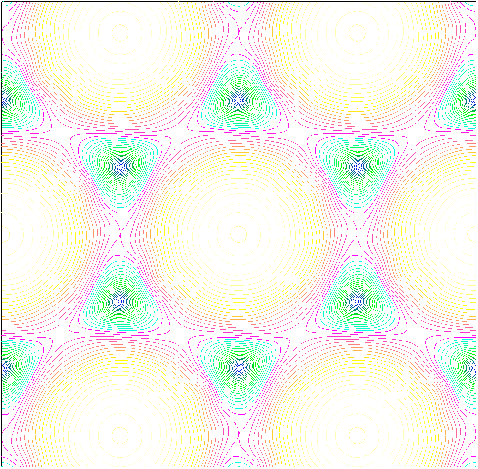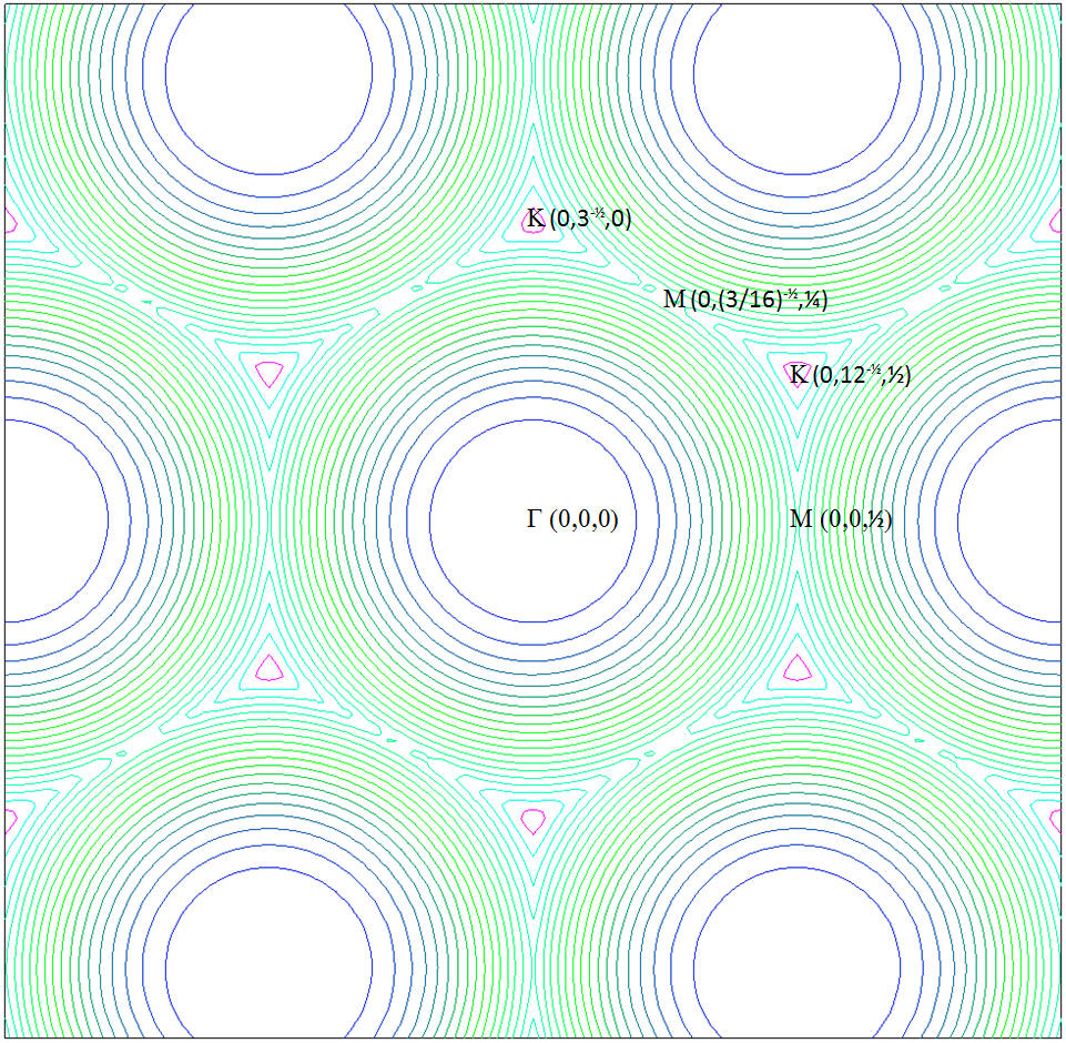 Lines through k-space are useful in showing the overall energy spectrum, but are limited in that they do not convey much information about the overall shape of individual bands.  A more useful picture is provided by a two-dimensional cut through k-space.  An example of such a section, centered on Γ and perpendicular to the Δ line is shown in Figure E2.  Three points of interest, Γ, K and M are indicated, along with their coordinates in k-space.
