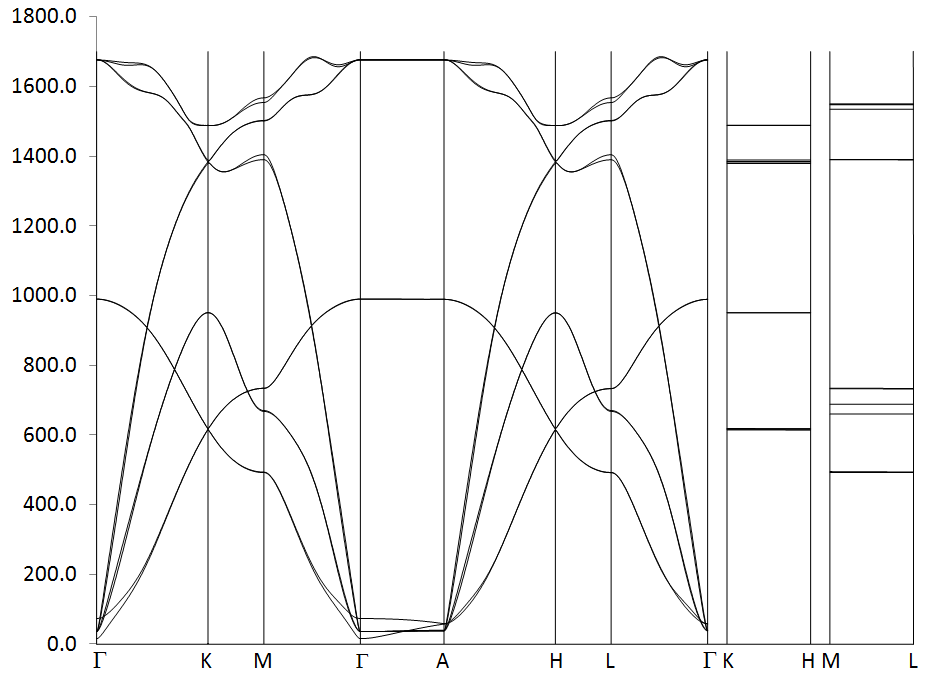 Using the 3x5x5 LUC a reasonable phonon band structure was generated, Figure P1.  Figure P2 shows the 3-D Excel map of Band 1, in the plane perpendicular to the unique axis, and centered on Γ.   As with the electronic structure, the phonon structure shows many of the qualitative features expected, e.g., bands crossing and the degeneracy at K.  A requirement of phonon spectra, that the lowest vibrational frequency should be 0.0 cm-1, was almost achieved. That the lowest vibrational frequency was 15.2 indicates that there is some error in the phonon calculation.  However, errors in vibrational frequencies due to computational issues tend to be largest in the lowest frequencies, and at higher frequencies the errors attributable to computational effects decrease to about 1 cm-1.