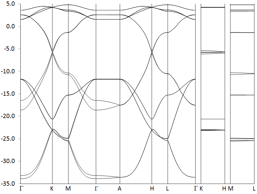Four carbon atoms contribute 16 valence electrons, so eight bands are occupied.  Over much of the Brillouin zone there is a distinct band-gap between the occupied and empty bands, the exception being at the region of line P, i.e., in the region connecting points K and H. In this region the band-gap drops to almost zero.