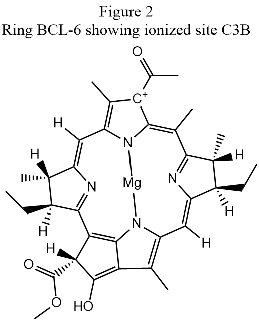 Identifying the cause of these faults is often quite difficult.  In the case of the first ionized site, "HETATM 5564 C3B BCL 6", the atom ionized is indicated at the top of the ring in Fig. 2 as "C+"  A superficial examination of the conjugated π-ring structure would suggest that this atom should either by hydrogenated or that there is a fault in the conjugation, but a careful comparison of the hydrogenation in Figs. 1 and 2 shows that the keto group an the bottom of Fig. 1 was incorrectly hydrogenated in Fig. 2.  If the spurious hydrogen atom in the hydroxyl at the bottom of Fig. 2 is removed, the conjugation changes to be the same as that in Fig. 1 and carbon atom C3B is neutral, as expected.