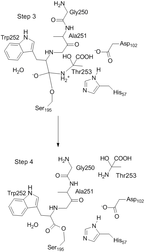 Transition state between Steps 3 and 4 of Chymotrypsin Mechanism