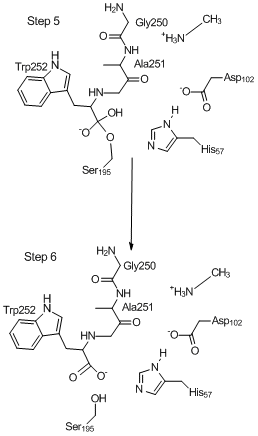 ![]() The final step in the chymotrypsin mechanism. The Trp252 - Ser195 ester-like bond splits, forming neutral Ser195 and Trp252 with a carboxylate ion at the C terminus. Because of the high activation barrier, this step is unlikely to occur. Toggle display all Toggle center picture Fit to screen Interesting parts: