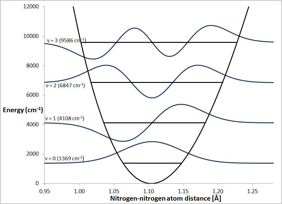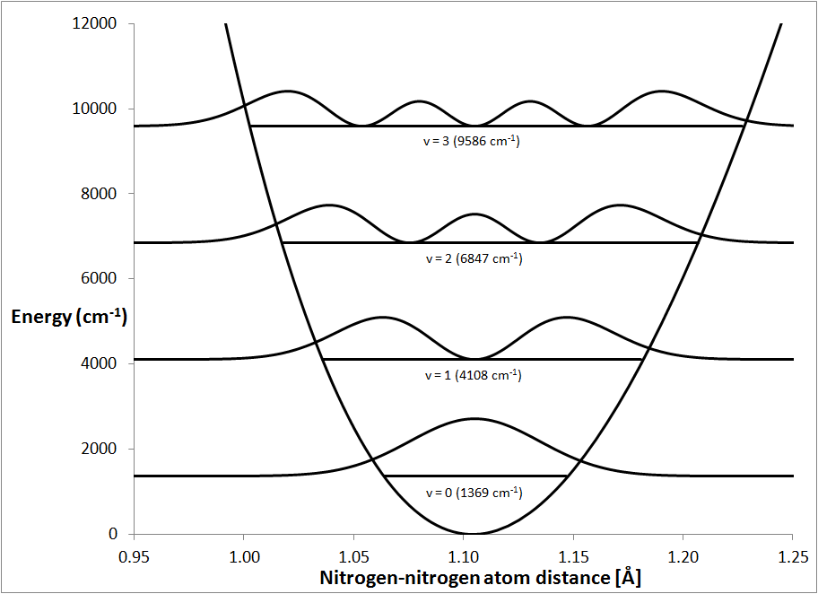 When the molecule is in its ground vibrational state the molecule is not vibrating, and the atoms are in their equilibrium position. This is represented in Fig. 2 by the small vertical line at 1.105 Å. For convenience, the energy at the bottom of the parabolic curve is defined as the zero of energy. When a nitrogen molecule is excited into its first vibrational state, v = 1, the atoms start to move in a simple harmonic motion. The time-average of this type of motion would show that, for most of their time, the atoms were near to their extreme stretched or compressed positions. This is indicated in Fig. 2 by the probability distribution of the atomic separations.