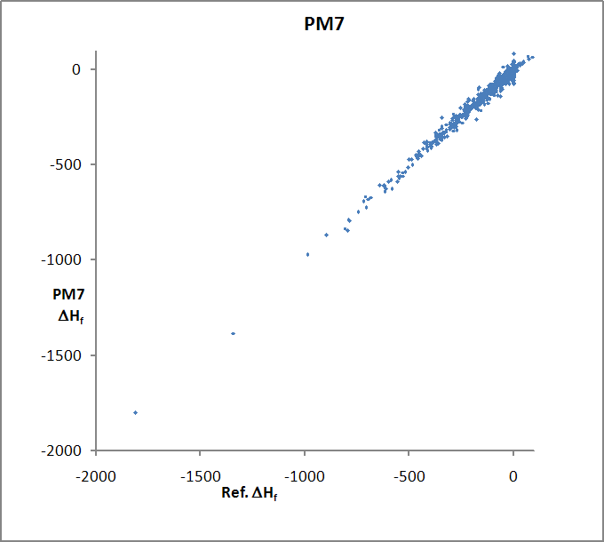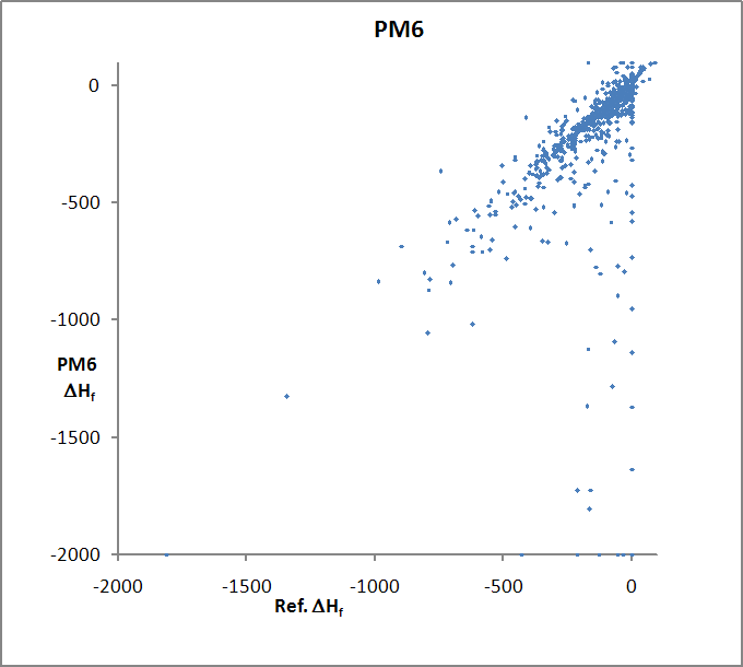 All values in Kcal/mole. 671 entries. Some values for PM6-D3H4 were outside the graph boundaries; these have been reset to the boundary. The sharp cutoff in the distribution of heats of formation in PM6-D3H4 at 0 kcal/mol is due to the small number of solids with positive heats of formation - most elements are solids, and by definition have a heat of formation of zero.