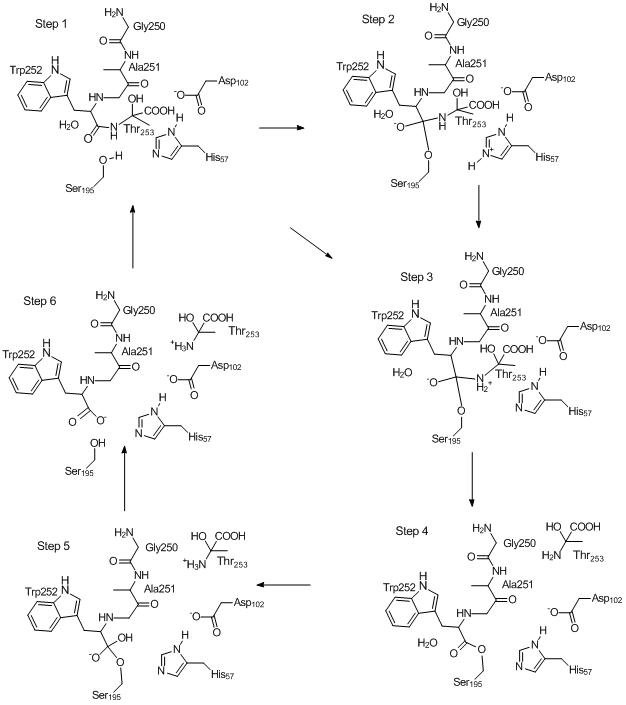 The mechanism whereby chymotrypsin catalyzes the hydrolysis of a peptide bond can be represented in several steps as shown in the figure below.  Each step can be defined as a stationary point on the Potential Energy Surface (PES). These stationary points were calculated using PM7, and can be investigated in detail in the links named "Step n" below. The starting point was 8GCH.pdb.  In 8GCH the substrate is the tripeptide Gly250-Ala251-Trp252, with Trp252 terminated by a carboxylic acid group.  This sequence also occurs in chymotrypsin at residues 205, 206, and 207, with residue 208 being Thr, so it is reasonable to assume that the substrate is the product of hydrolysis of the Trp-Thr peptide bond in a chymotrypsin by the chymotrypsin in 8GCH.  In order to begin modeling the chymotrypsin mechanism, one of the oxygen atoms on carboxylate on Trp252 was replaced by Thr253, this giving a peptide bond ideally positioned for the simulation described here.