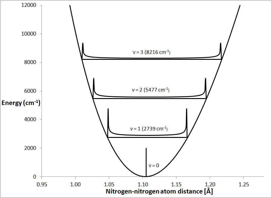 When the molecule is in its ground vibrational state the molecule is not vibrating, and the atoms are in their equilibrium position. This is represented in Fig. 2 by the small vertical line at 1.105 Å. For convenience, the energy at the bottom of the parabolic curve is defined as the zero of energy. When a nitrogen molecule is excited into its first vibrational state, v = 1, the atoms start to move in a simple harmonic motion. The time-average of this type of motion would show that, for most of their time, the atoms were near to their extreme stretched or compressed positions. This is indicated in Fig. 2 by the probability distribution of the atomic separations.